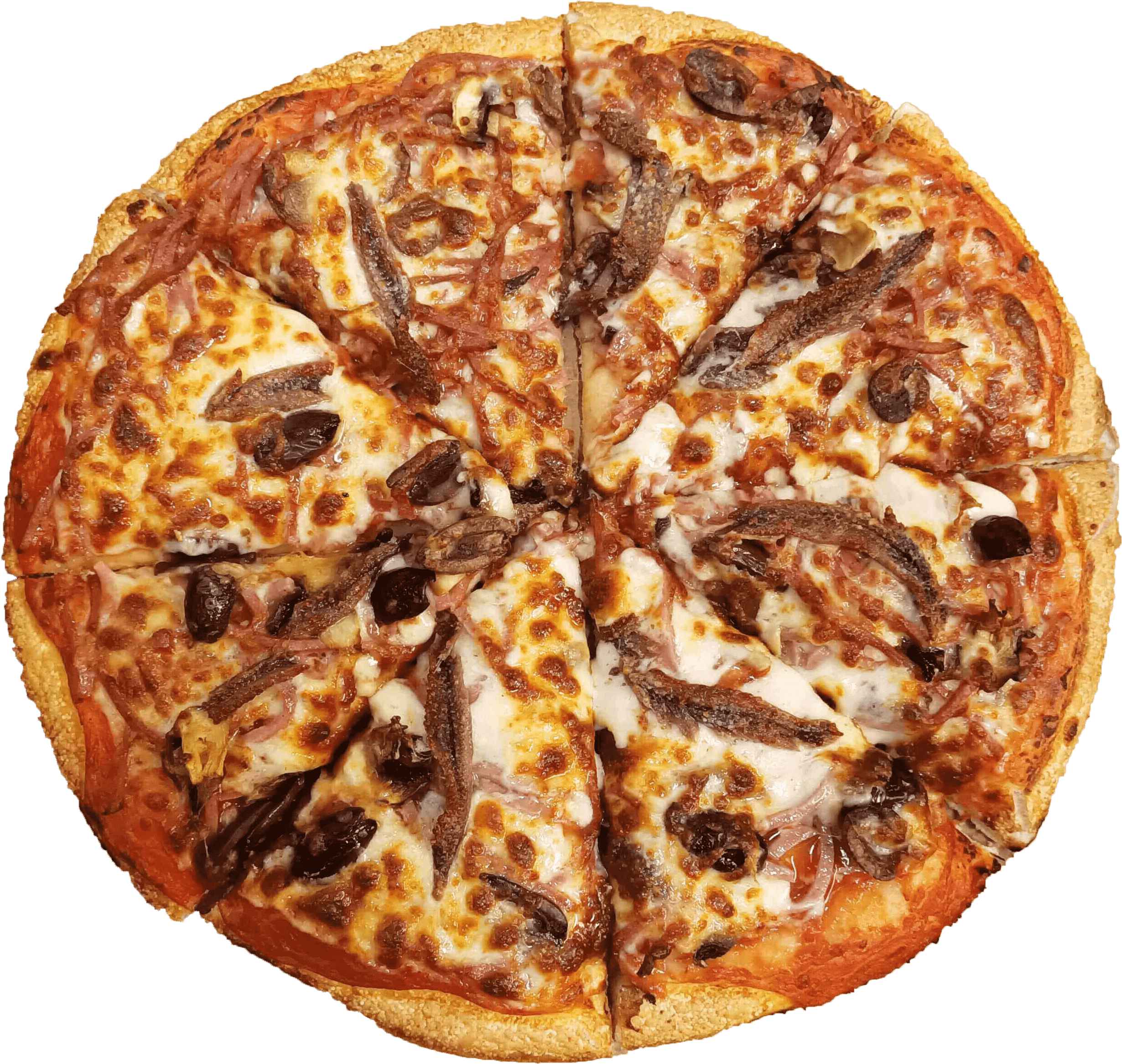 Tomato base, cheese, anchovies, olives, mixed herbs
