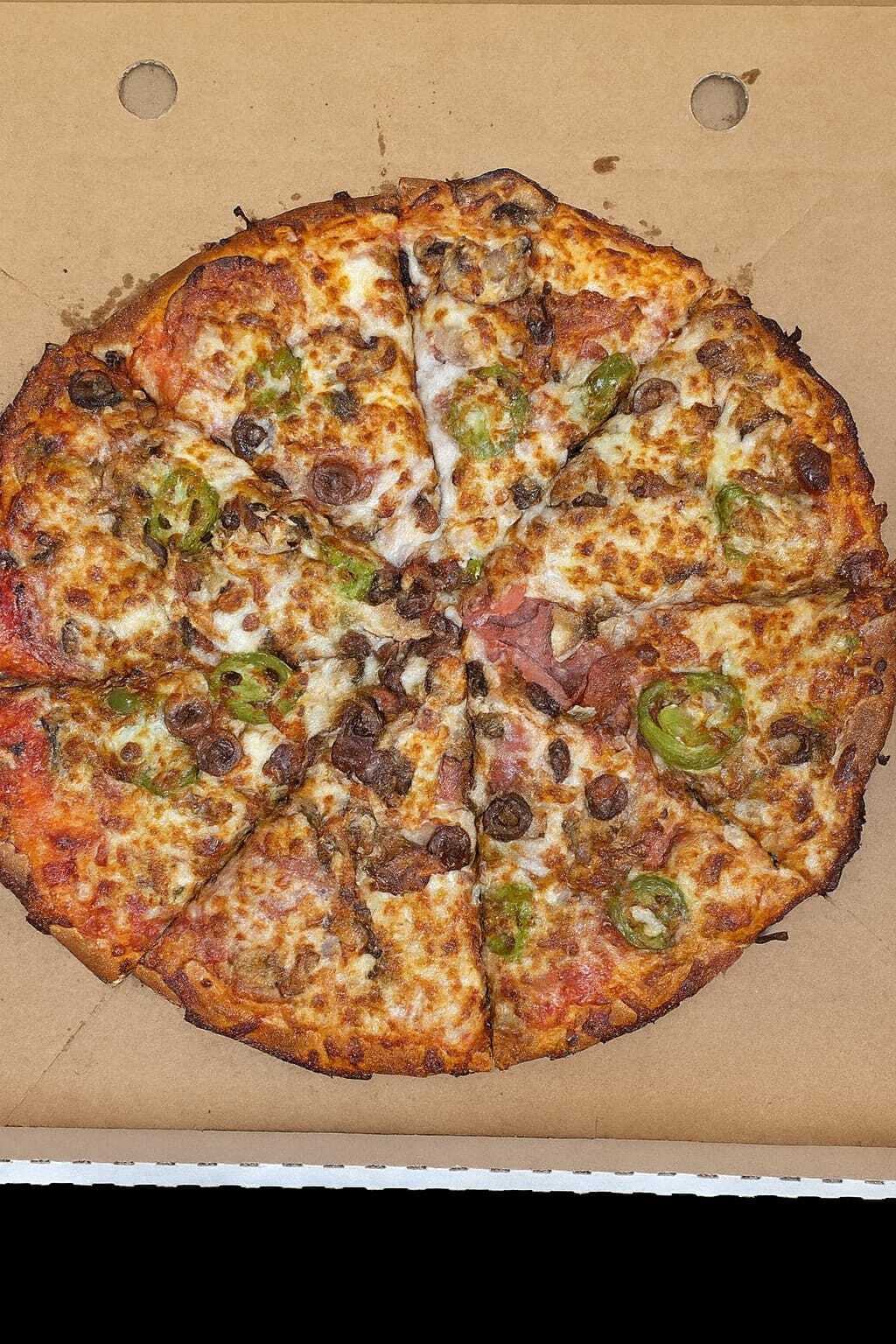 BBQ Beef and OnionBBQ base, beef, onion, cheese BBQ Beef and OnionBBQ base, beef, onion, cheese- × - BBQ Beef and OnionBBQ base, beef, onion, cheese- Choose one - Base for Large Pizza - 0  Beef and Bacon RanchBeef, cheese, bacon, onion, BBQ base, ranch dressing swirl Beef and Bacon RanchBeef, cheese, bacon, onion, BBQ base, ranch dressing swirl- × - Beef and Bacon RanchBeef, cheese, bacon, onion, BBQ base, ranch dressing swirl- Choose one - Base for Large Pizza - 0 NapolitanaTomato base, cheese, anchovies, olives, mixed herbs- × - NapolitanaTomato base, cheese, anchovies, olives, mixed herbs- Choose one - Base for Large Pizza - 0  ItalianTomato Base, Cheese, Ham, Hot Salami, Mushroom, Mixed Capsicum, Garlic And Chilli Flakes ItalianTomato Base, Cheese, Ham, Hot Salami, Mushroom, Mixed Capsicum, Garlic And Chilli Flakes- × - ItalianTomato Base, Cheese, Ham, Hot Salami, Mushroom, Mixed Capsicum, Garlic And Chilli Flakes- Choose one - Base for Large Pizza - 0 MexicanHot salami, mixed capsicum, onion and olives- × - MexicanHot salami, mixed capsicum, onion and olives- Choose one - Base for Large Pizza - 0  Chicken HawaiianTomato base, cheese, chicken, ham, pineapple Chicken HawaiianTomato base, cheese, chicken, ham, pineapple- × - Chicken HawaiianTomato base, cheese, chicken, ham, pineapple- Choose one - Base for Large Pizza - 0  Satay ChickenTomato base, cheese, satay sauce marinated chicken, onion, mixed capsicum Satay ChickenTomato base, cheese, satay sauce marinated chicken, onion, mixed capsicum- × - Satay ChickenTomato base, cheese, satay sauce marinated chicken, onion, mixed capsicum- Choose one - Base for Large Pizza - 0 Spicy ChickenTomato base, cheese, chicken, onion, mixed capsicum, cajun spice, jalapeno, garlic- × - Spicy ChickenTomato base, cheese, chicken, onion, mixed capsicum, cajun spice, jalapeno, garlic- Choose one - Base for Large Pizza - 0  AmericanoTomato base cheese, hot salami, mushrooms, olives and jalapenos AmericanoTomato base cheese, hot salami, mushrooms, olives and jalapenos- × - AmericanoTomato base cheese, hot salami, mushrooms, olives and jalapenos- Choose one - Base for Large Pizza - 0  MargheritaTomato base, double cheese, mixed herbs, sliced tomatoes, parmesan, garlic MargheritaTomato base, double cheese, mixed herbs, sliced tomatoes, parmesan, garlic- × - MargheritaTomato base, double cheese, mixed herbs, sliced tomatoes, parmesan, garlic- Choose one - Base for Large Pizza - 0  HawaiianTomato base, cheese, ham, pineapple HawaiianTomato base, cheese, ham, pineapple- × - HawaiianTomato base, cheese, ham, pineapple- Choose one - Base for Large Pizza - 0  BBQ Kebab PizzaTomato base, cheese, lamb kebab, onion, BBQ sauce swirl BBQ Kebab PizzaTomato base, cheese, lamb kebab, onion, BBQ sauce swirl- × - BBQ Kebab PizzaTomato base, cheese, lamb kebab, onion, BBQ sauce swirl- Choose one - Base for Large Pizza - 0  Chicken Kebab PizzaTomato Base, cheese, chicken kebab, onion, mixed capsicum, ranch dressing swirl Chicken Kebab PizzaTomato Base, cheese, chicken kebab, onion, mixed capsicum, ranch dressing swirl- × - Chicken Kebab PizzaTomato Base, cheese, chicken kebab, onion, mixed capsicum, ranch dressing swirl- Choose one - Base for Large Pizza - 0 Spicy Lamb KebabTomato base, cheese, lamb kebab, onion, jalapenos, chilli flakes, sweet chili swirl- × - Spicy Lamb KebabTomato base, cheese, lamb kebab, onion, jalapenos, chilli flakes, sweet chili swirl- Choose one - Base for Large Pizza - 0 Lamb Kebab PizzaTomato base, cheese, lamb kebab, onion, garlic sauce swirl- × - Lamb Kebab PizzaTomato base, cheese, lamb kebab, onion, garlic sauce swirl- Choose one - Base for Large Pizza - 0 Classic VegetarianTomato base, cheese, onion, capsicum, mushroom, pineapple- × - Classic VegetarianTomato base, cheese, onion, capsicum, mushroom, pineapple- Choose one - Base for Large Pizza - 0  Value VegetarianTomato base, cheese, spinach leaves, onion, pineapple Value VegetarianTomato base, cheese, spinach leaves, onion, pineapple- × - Value VegetarianTomato base, cheese, spinach leaves, onion, pineapple- Choose one - Base for Large Pizza - 0  Garlic PizzaGarlic base, cheese Garlic PizzaGarlic base, cheese- × - Garlic PizzaGarlic base, cheese- Choose one - Base for Large Pizza - 0  Cheese LoversTomato base, cheese, cheese and more cheese Cheese LoversTomato base, cheese, cheese and more cheese- × - Cheese LoversTomato base, cheese, cheese and more cheese- Choose one - Base for LRG VP - 0  Best SellerHam and CheeseTomato base, cheese, ham Best SellerHam and CheeseTomato base, cheese, ham- × - Ham and CheeseTomato base, cheese, ham- Choose one - Base for Large Pizza - 0  Most PopularPepperoniTomato base, cheese, pepperoni Most PopularPepperoniTomato base, cheese, pepperoni- × - PepperoniTomato base, cheese, pepperoni- Choose one - Base for Large Pizza - 0  BBQ MeatloversBBQ base, cheese, ham, beef, diced bacon, pepperoni, sausages BBQ MeatloversBBQ base, cheese, ham, beef, diced bacon, pepperoni, sausages- × - BBQ MeatloversBBQ base, cheese, ham, beef, diced bacon, pepperoni, sausages- Choose one - Base for Large Pizza - 0  SupremeTomato base, cheese, beef, pepperoni, sausages, mushroom, pineapple, olives, mixed capsicum, onion, SupremeTomato base, cheese, beef, pepperoni, sausages, mushroom, pineapple, olives, mixed capsicum, onion,- × - SupremeTomato base, cheese, beef, pepperoni, sausages, mushroom, pineapple, olives, mixed capsicum, onion,- Choose one - Base for Large Pizza Required- Supreme Option Required- 0  BBQ ChickenBBQ base, cheese, chicken, onion BBQ ChickenBBQ base, cheese, chicken, onion- × - BBQ ChickenBBQ base, cheese, chicken, onion- Choose one - Base for Large Pizza - 0  The AussieTomato base, cheese, ham, diced bacon, egg The AussieTomato base, cheese, ham, diced bacon, egg- × - The AussieTomato base, cheese, ham, diced bacon, egg- Choose one - Base for Large Pizza - 0  Hot and Spicytomato base, cheese, onion, jalapenos, sliced tomatoes, hot sala
