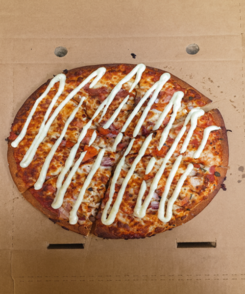 Lrg Chicken Club Tomato base, cheese, chicken, onion, mixed capsicum, sliced tomatoes, mushroom, diced bacon, garlic sauce swirl, parmesan