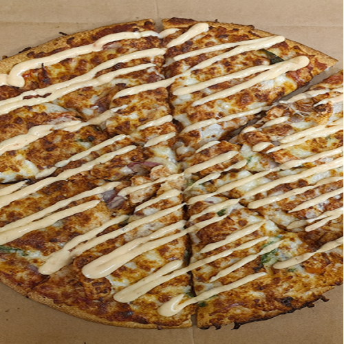 Lrg Chicken Kebab Pizzas Tomato Base, cheese, chicken kebab, onion, mixed capsicum, ranch dressing swirl