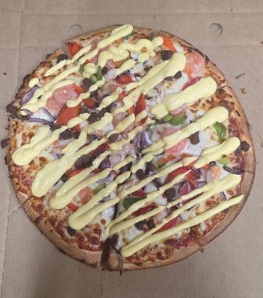 Lrg The Lot Tomato base, cheese, onion, capsicum, mushrooms, olives, pineapple, bacon, ham, pepperoni, beef, sausages, hollandaise sauce swirl